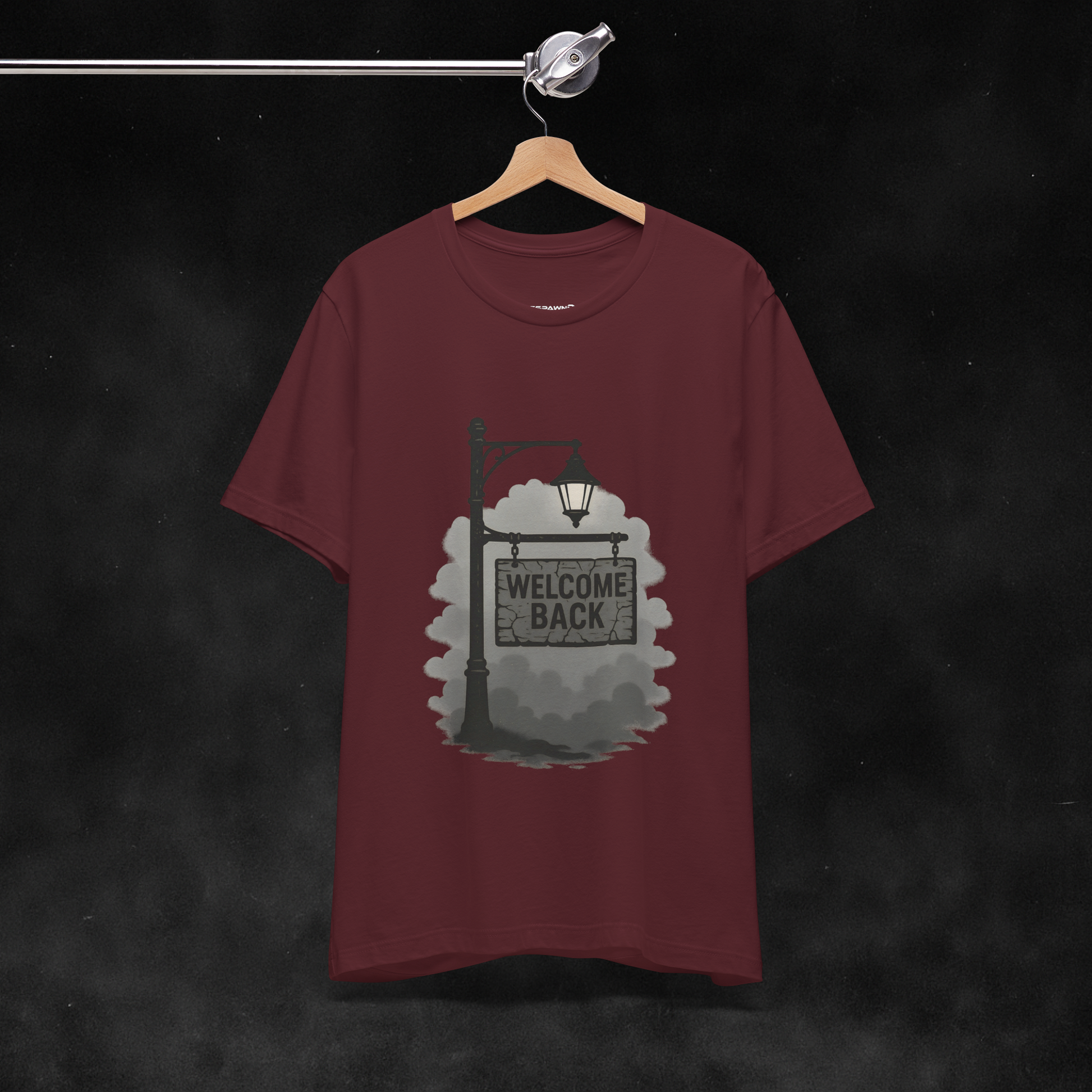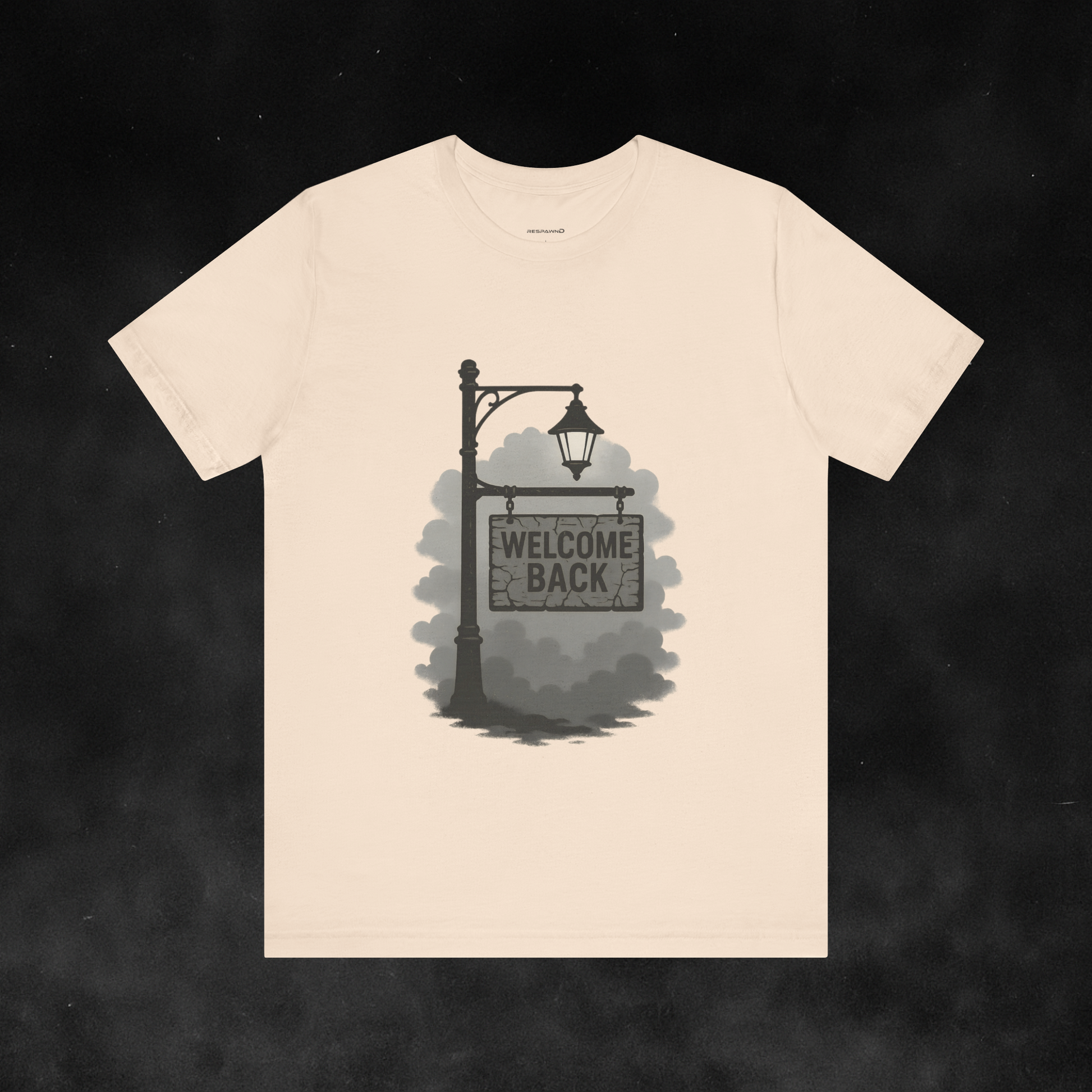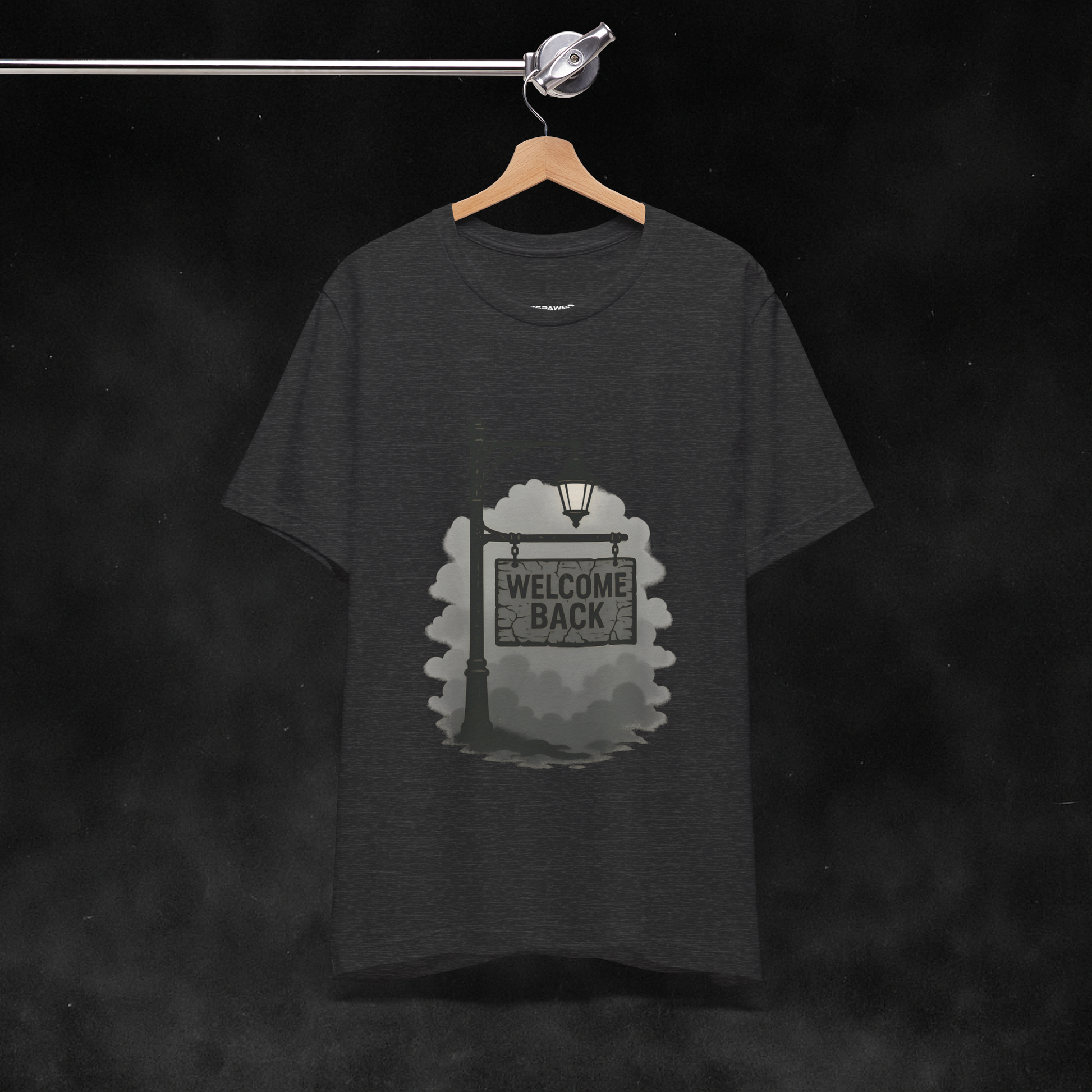 Step back into the mist. The Welcome Back Tee captures eerie nostalgia with its cracked sign and fog-drenched lantern, perfect for late-night gamers and horror fans alike. Printed on ultra-soft cotton for all-day comfort, whether you’re AFK or deep in a boss fight.